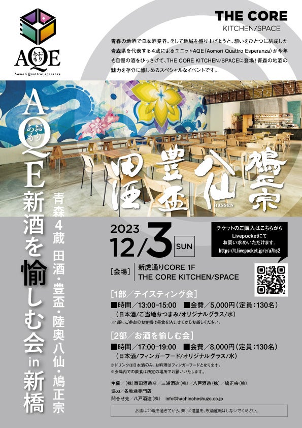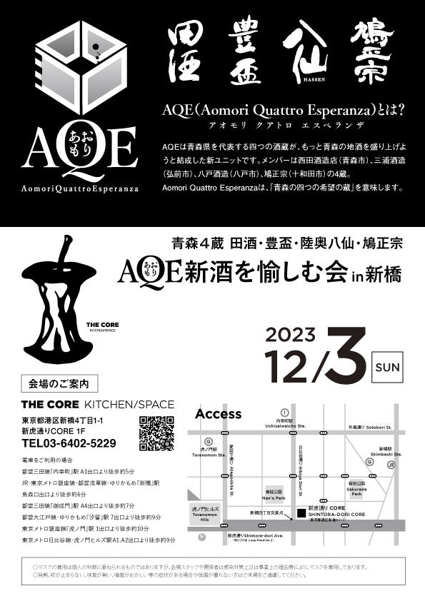 青森県を代表する4蔵、西田酒造店(青森市)、三浦酒造(弘前市)、八戸酒造(八戸市)、鳩正宗(十和田市)は、2023年12月3日(日)に新橋にある THE CORE KITCHEN/SPACE で 「青森4蔵 田酒・豊盃・陸奥八仙・鳩正宗 AQE新酒を愉しむ会 in 新橋」 を開催いたします。1部はフードなしの【テイスティング会】、2部はフィンガーフードとお酒の【お酒を愉しむ会】となります。田酒・豊盃・陸奥八仙・鳩正宗の4蔵の新酒と渾身のお酒を一度にお楽しみいただけますこの機会に、青森県の地酒で美味しい時間を過ごしてみませんか。皆さまのお越しを心よりお待ちしております!