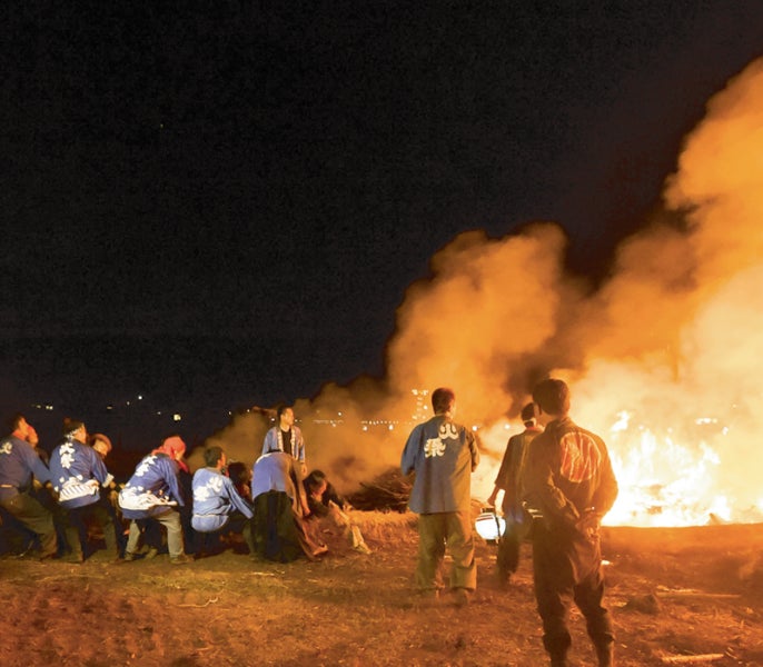 また、行事の由来については、往昔、向田は製塩業が盛んで御収納米が納められない年には代わりに塩を納め、野崎の御蔵へ運んだほどでした。ある年、塩やきのシバがたくさん余ったので燃やして若衆の娯楽にしたのがこの行事の始まりだという説もあります。