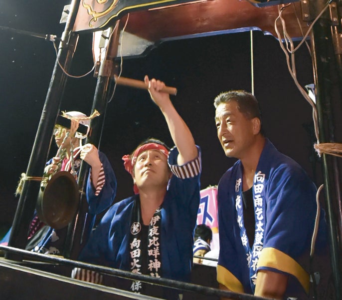 「向田の火祭」能登島向田町に鎮座する伊夜比咩神社の夏祭で、毎年7月の最終土曜日に行われます。古来、オスズミ祭と呼ばれ納涼祭の文字があてられ、近年では「向田の火祭」と呼ばれ石川県指定無形民俗文化財に指定されています。約30メートルの松明の大きさから日本三大火祭のひとつに数えられています。伊夜比咩神社から神輿や奉燈を崎山広場に担ぎ出し、設置された巨大な柱松明の周りを7周練り歩きます。その後、祭り参加者はそれぞれ手に持った手松明を振りながら周回し、号令で柱松明に投げつけます。柱松明は巨大な火焔の柱と化し、四方に張りわたしたハイヅナが切れると柱松明が轟音を立てて倒壊、倒れた方向によって豊漁、豊作を占います。また、柱松明の先につけられている御幣を取ったものは延命息災が叶うと言われています。
