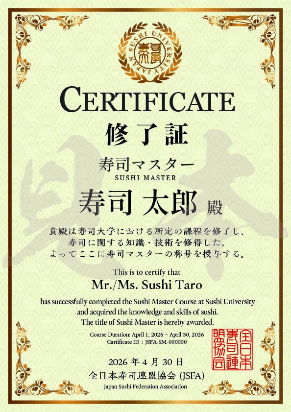 全課程を修了すると、審査を経て全日本寿司連盟協会認定の「寿司マスター | SUSHI MASTER®」の資格と合格証が発行されます。本資格は寿司大学でしか取得できない唯一の資格であり、寿司の技術と知識を客観的に証明するものとして、就職や開業の際にも活用いただけます。