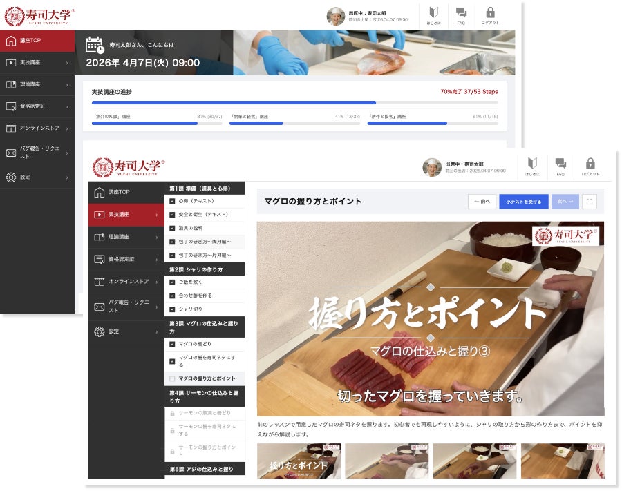 寿司大学はオンライン教育プラットフォームとして設計されているため、すでに現場で活躍している寿司職人や、寿司学校に通学中の方にとっても価値のある学びの場となります。