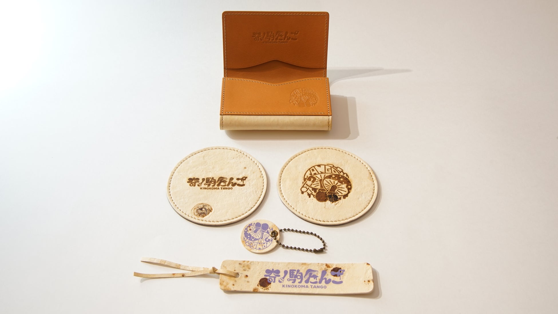 今回のコラボレーション製品は、キノコの菌糸体100%で作られた「キノコの皮KINOLI®」を使用し、キノコに夢中なキノコ人間VTuber「奇ノ駒たんご」デザインを施した限定アイテムです。キノコの菌糸が成長する過程で生まれる一点ものの模様と、手に吸い付くような優しい肌触りが特徴で、従来の革製品にはない独特の質感と環境性能を兼ね備えています。