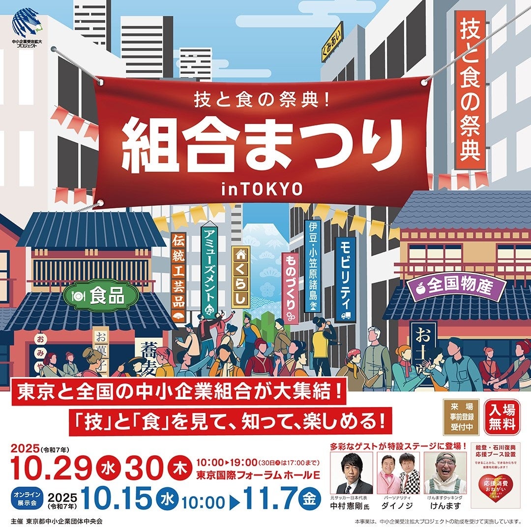 東京都中小企業団体中央会(所在地:東京都中央区、会長:會津 健)は、「中小企業受注拡大プロジェクト」の一環として、東京と全国の中小企業組合が大集結!「 組合まつり in TOKYO ~技と食の祭典!~」(入場無料)を開催いたします。
