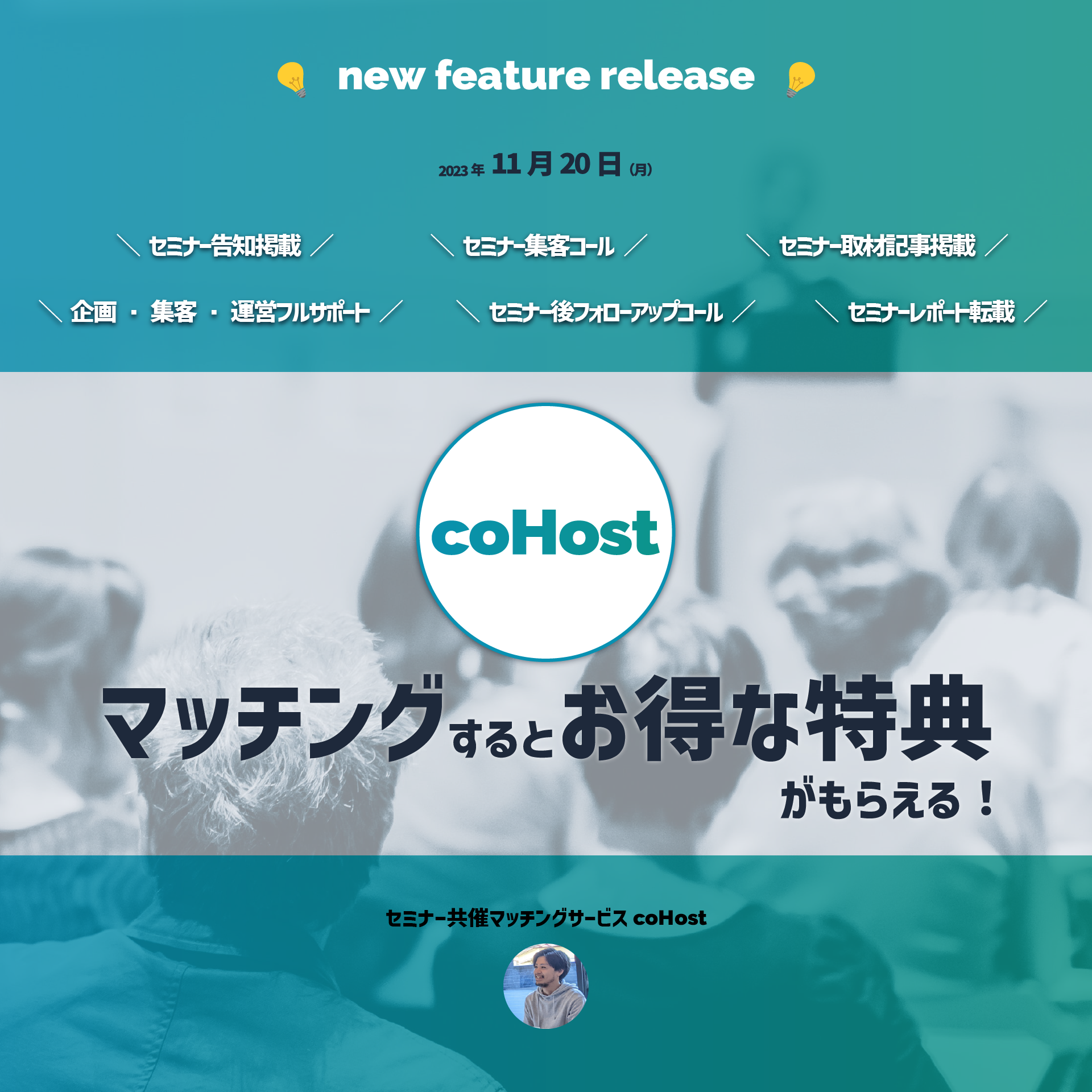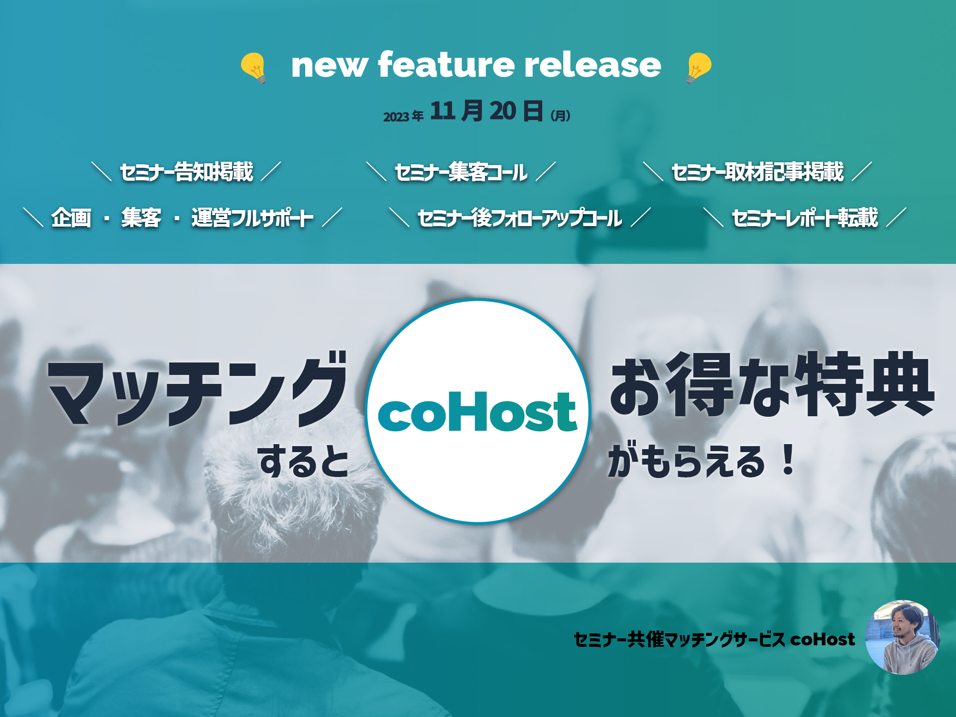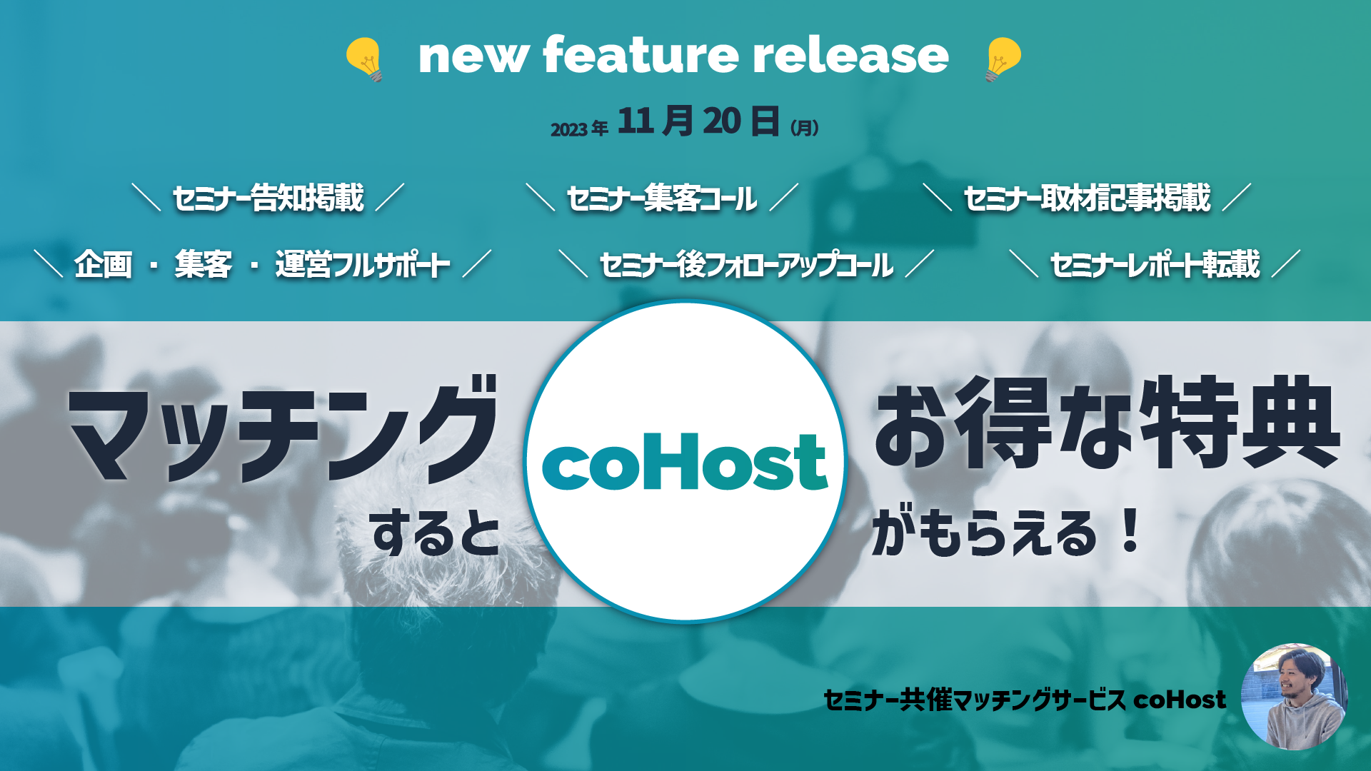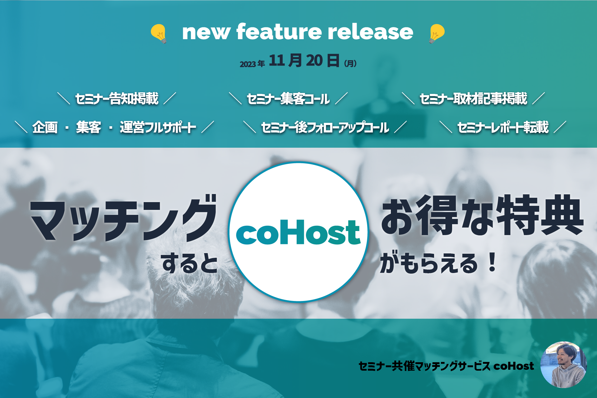 セミナー共催マッチングサービス「coHost」は、当該サービス内でマッチングしたユーザー(以下「マッチングユーザー」とします。)が利用できる「マッチング特典」の提供を開始します。(提供開始日は下記参照)