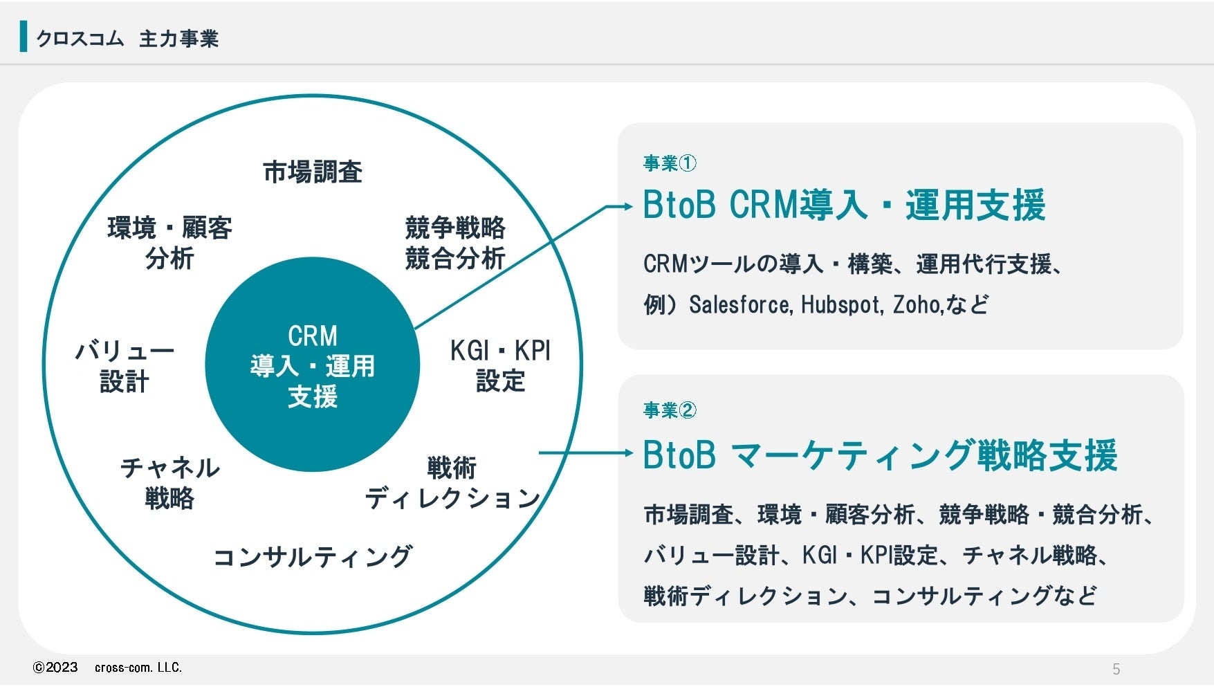 クロスコムは、BtoBマーケティングに特化した戦略パートナーとして、企業の商談数・新規顧客数の獲得に貢献するために、MA・CRMツールの導入・運用代行も行っています。BtoB営業出身である代表が、「5万円でコンテンツ企画・制作」サービスの提供にとどまらず、MA・CRMの運用成果を最大化するためのマーケティング支援にも取り組むことで、「マーケティングの全体最適」構想を強化していきます。