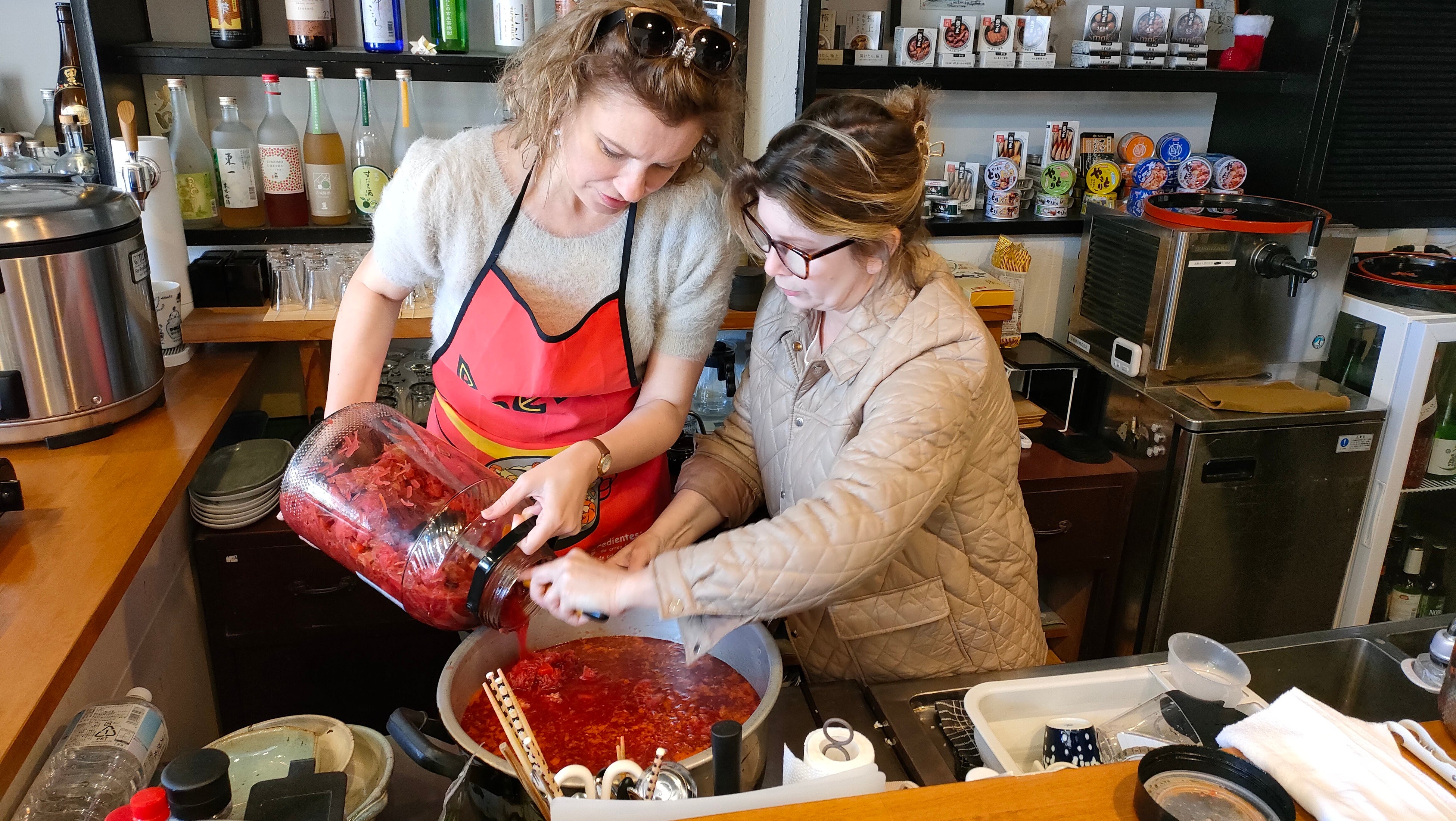 佐賀市のウクライナ料理イベントで腕を振るうアンナさん(右)=2023年4月