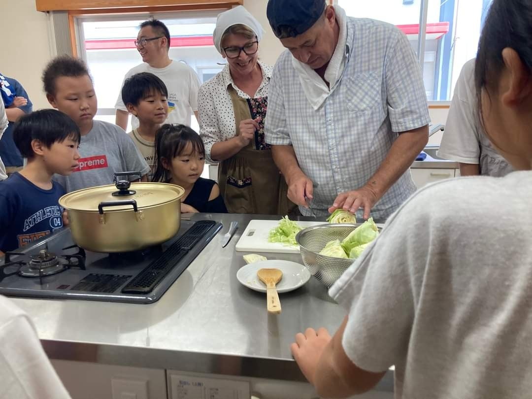 子どもたちとウクライナ料理を一緒につくるアンナさん(中央)=2023年8月