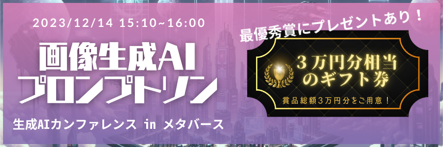 「生成AIカンファレンス in メタバース」のイベント内にて生成AIを使用した画像生成AIプロンプトソンを開催いたします。