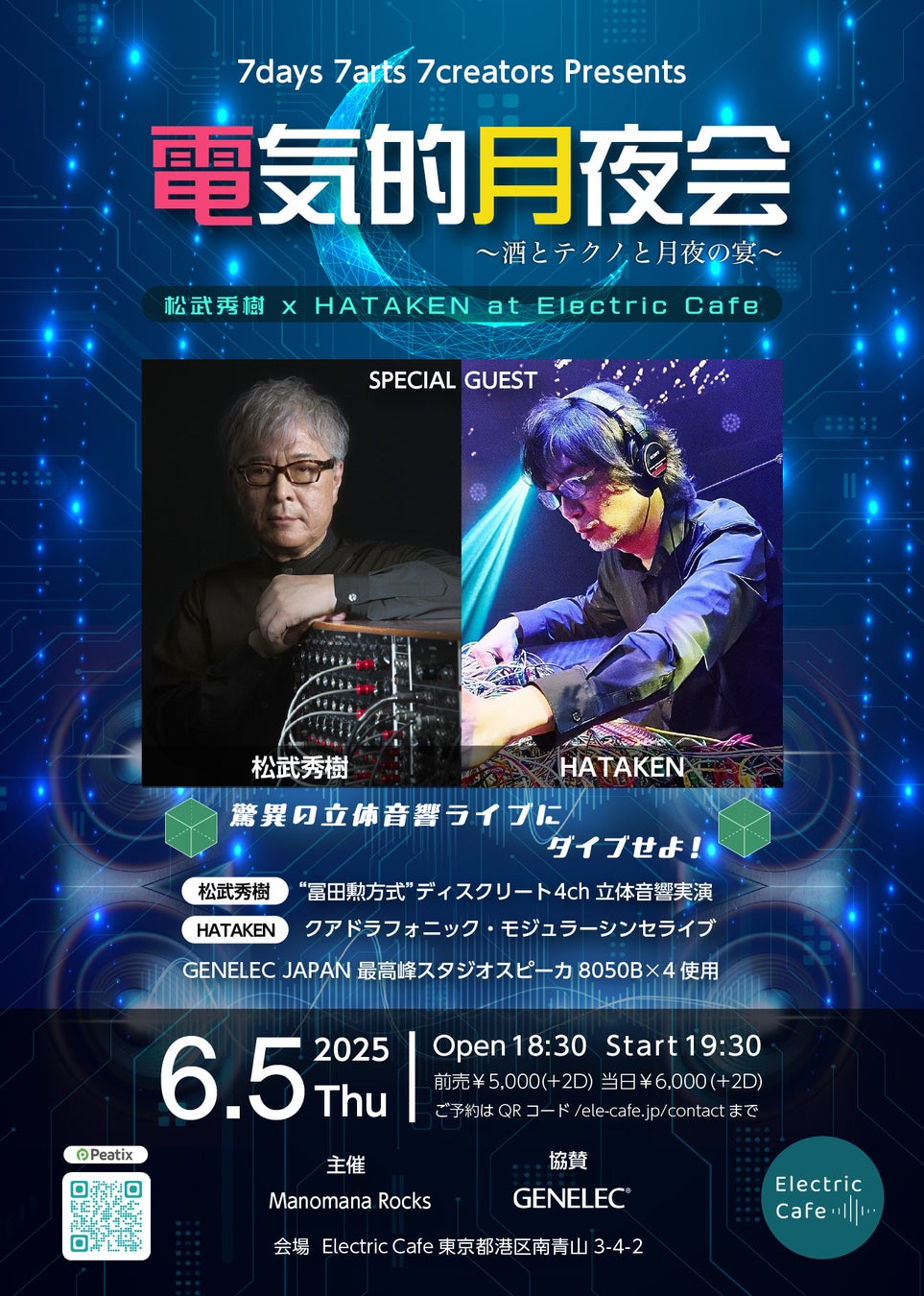 シンセサイザーの世界において、その名を聞けば誰もが膝を打つであろう二人が、一夜限りのスペシャルイベントで共演を果たす。ミュージック・バーElectric Cafe(南青山)を舞台に、松武秀樹とHATAKENの夢のコラボが実現した「電気的月夜会」。マニア垂涎の実機を用いたライブ演奏のほか、立体音響による大迫力サラウンド、そしてミュージックバーならではのオリジナルカクテルの提供など、誰もが感性を揺さぶられる夜になるはずだ。