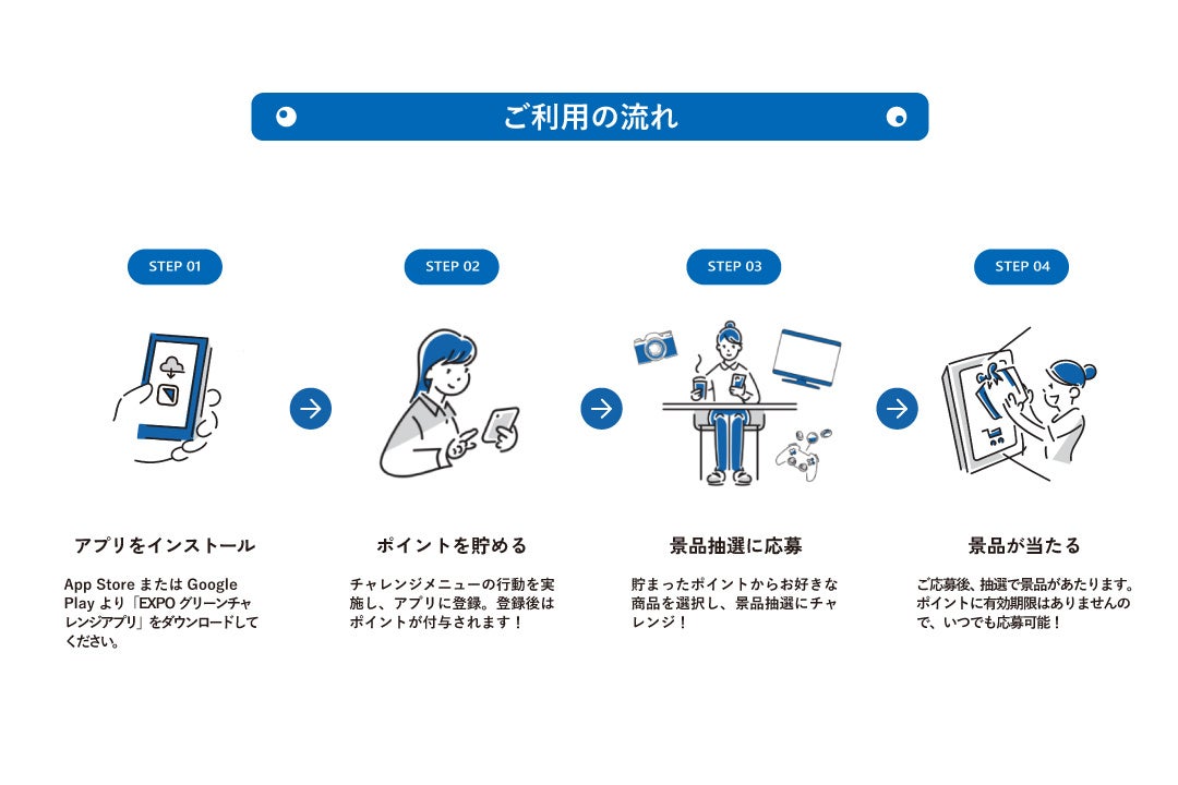 本アプリでは、脱炭素につながる個人の行動変容を促進するために、家庭系廃食用油の回収やマイボトルなど7つの「チャレンジメニュー」を設定し、継続して取り組んでもらうことで、「チャレンジメニュー」が大阪・関西万博を通じて当たり前の行動となり、「万博のレガシー」として残っていくことを目指していきます。