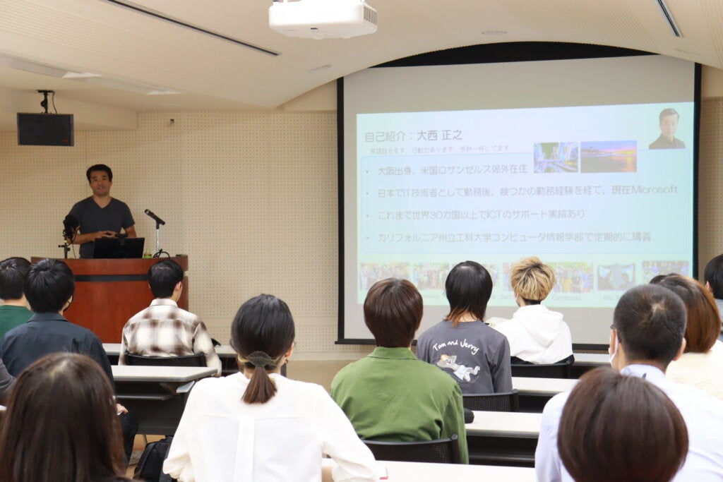 大西正之氏(写真)が学生や教職員,一般向けに講演。日本とアメリカの考え方の違いや失われた30年で生じた国際格差について触れ,これからの社会を担う学生たちに対し熱いメッセージを送りました。