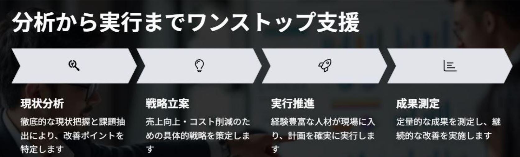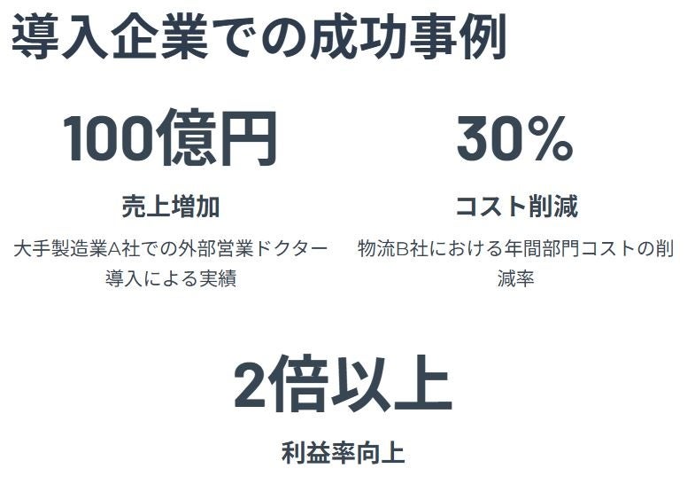 成果報酬型モデル企業のKPI達成や売上・利益成長に連動して報酬を設計。初期コスト不要で導入しやすい。ハイクラス人材が実働大手金融・商社・コンサル出身者などが“営業ドクター”としてプロジェクト単位で参画。信用補完スキーム紹介保証・成果保証などで企業の「不安の壁」を突破。