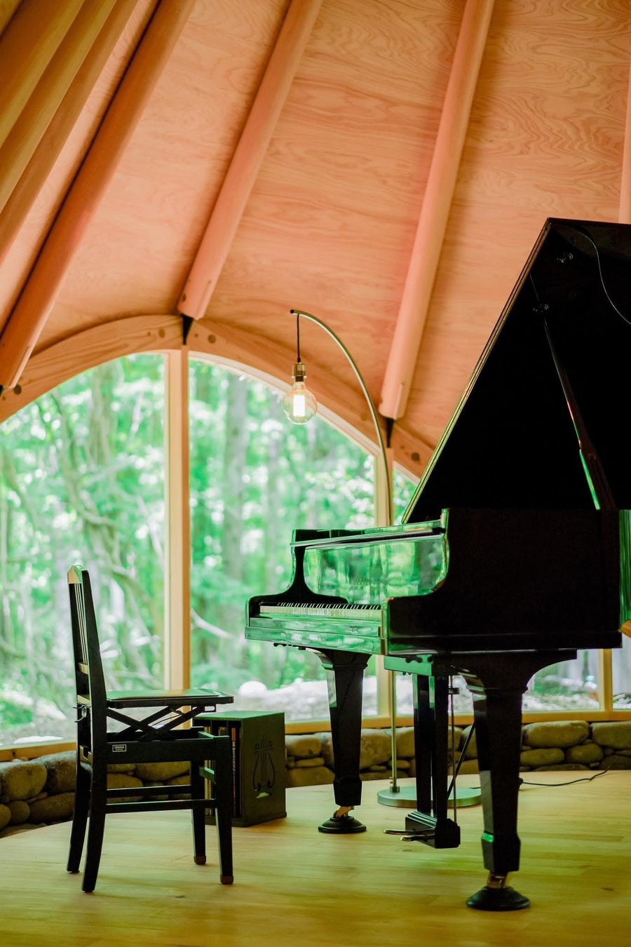 その思想から、建築は土地の声に耳を澄まし、そこにある石や土と対話するように形づくられました。計画や作為を超え、森が、ピアノが、そして関わる人々の想いが重なり合い、物語が自然と「紡がれていく」。その軌跡を捉えました。