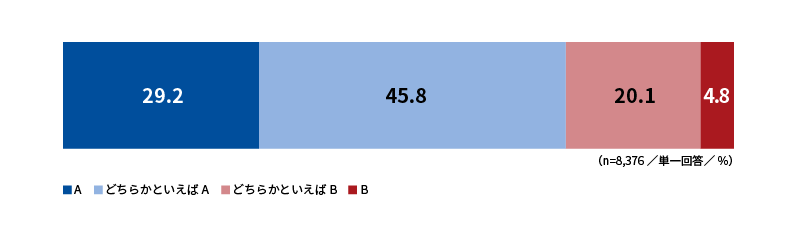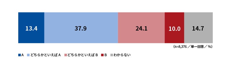 図表4:「あなたの会社に関してお聞きします。あなたが把握している範囲で、AとBのどちらに近いか、選択肢の中から最も近いと思うものを1つ選んでください。/あなたの会社では、人事評価がより反映されているのは、「A.給料(月給や賞与の増減)」と「B.仕事の機会(希望する仕事が任されたり、異動希望が叶うこと)」のどちらですか」の回答結果