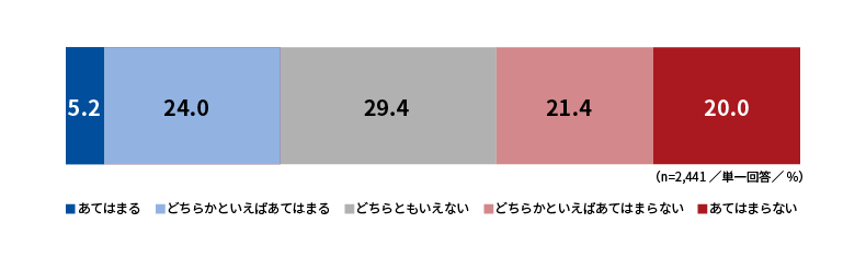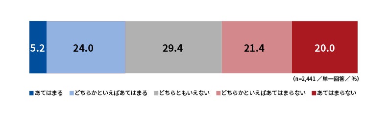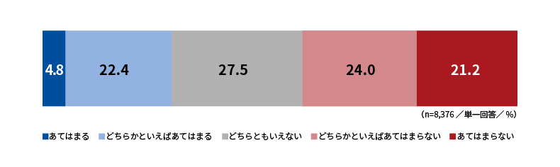 ・仕事や会社に対する考えの中で、今の年収にある程度満足している人(「あてはまる」「どちらかといえばあてはまる」と回答した人)が全体の3割に満たない27.2%であることが明らかになりました。一方で、満足していない人(「あてはまらない」「どちらかといえばあてはまらない」と回答した人)は45.2%にも及びます。
