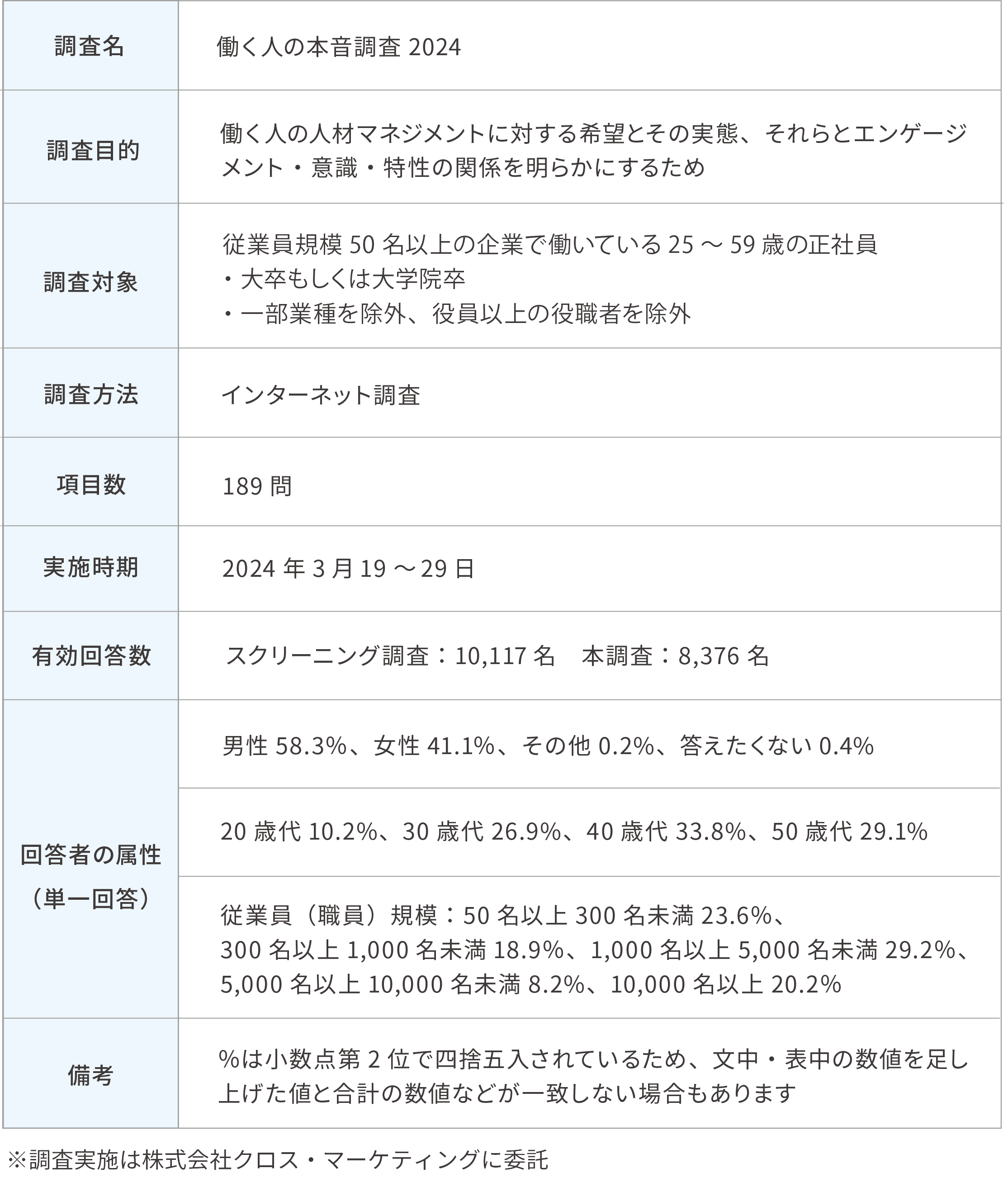 今回は、「働く人の本音調査2024」と題して、働く人はどのような人材マネジメントを求めているのか、そして、それぞれが所属する組織の人材マネジメントの実態はどうなっているのかということを軸に、それらのギャップの程度や、ギャップがどのような影響を及ぼしうるのか、ということを確認しました。