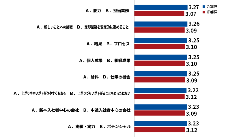 次に、ギャップが及ぼす影響のひとつとして、図表5に示したすべての項目で、希望と実態が合致している人たちは、それらが乖離している人たちと比べてワーク・エンゲージメントが高い傾向にあることが確認できました。こういった人材マネジメントに関する事項が、働く一人ひとりが前向きに仕事に取り組めるかどうかということに強く関わっていることを改めて知ることができ、制度設計のお手伝いを行っている当社としては、身の引き締まる思いです。