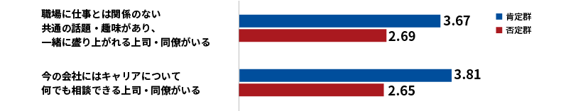 ・この図表から、今の会社に、仕事とは関係のない共通の話題・趣味のことで一緒に盛り上がれる上司・同僚がいる人、キャリアについて何でも相談できる上司・同僚がいる人は、そうでない人よりも、ワーク・エンゲージメントスコアが明確に高いことが読み取れます。