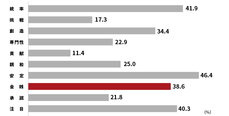 ・データを分析すると、金銭(38.6%)よりも、安定(46.4%)や統率(41.9%)や注目(40.3%)の方が高い数値になっています。つまり、今回の回答者が特別金銭を重視しているわけではなく、金銭以上にこれらの要素でモチベーションを掻き立てられる人が多いと言えます。それにも関わらず、年収に満足している人が3割未満で、人事評価を機会より給料に反映してほしいと望む人が多いということは、回答者の給料に対する不満は根強いものだと考えられます。さらに、今回の回答者がとりたてて金銭を重視している人たちというわけではないことを踏まえると、給料に対する不満は多くの日本のビジネスパーソンが抱えているものと考えられるのではないでしょうか。