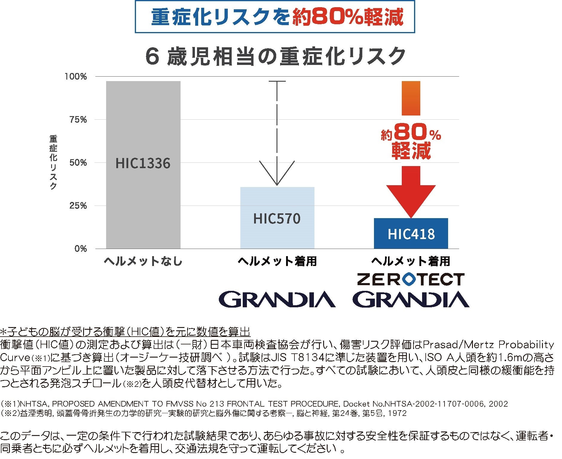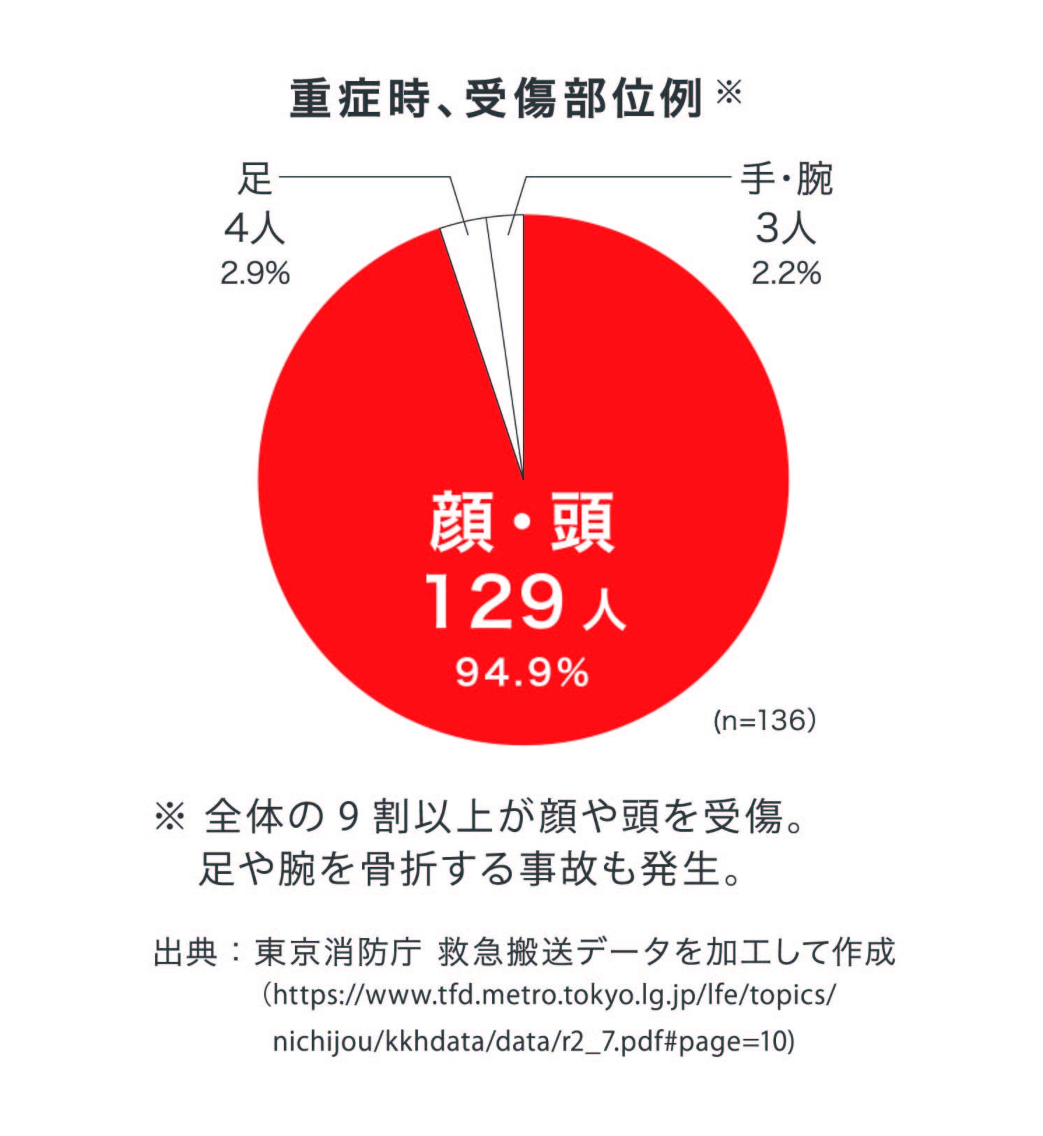 子ども乗せ自転車の転倒による頭部損傷事故は年間100件(子どもの事故防止に関する関係省庁連絡会議より)にものぼります。事故事例を収集・検証した結果、重症時の受傷部位は9割以上が顔や頭であることがわかりました。これにより、子どもの頭部を守る「グランディア」の開発に至りました。