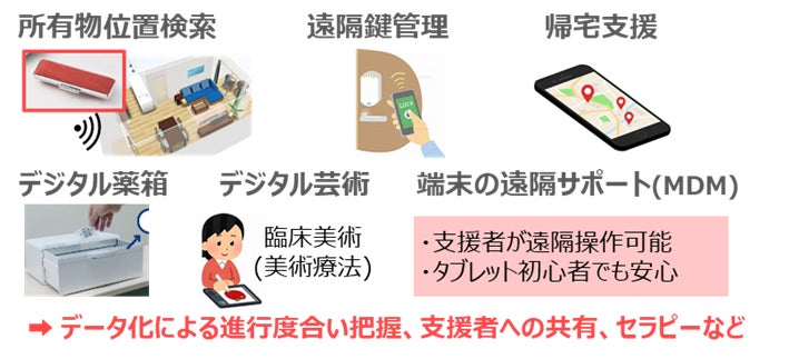 ● ICタグ、センサー、デジタル機器とタブレットの組み合わせによる、「大事なモノの場所をお知らせ」「外出先からの鍵開閉状態確認、鍵ロック」「自宅までの経路お知らせ」「服薬の予定、飲み忘れお知らせ」