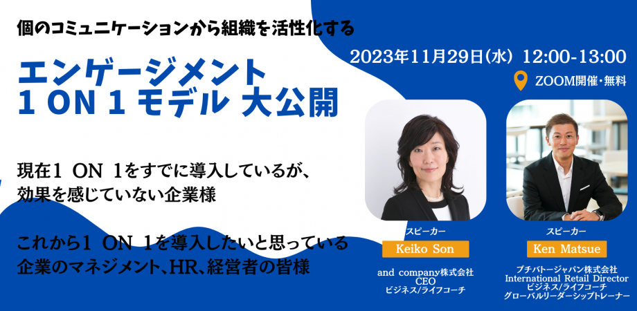 オンラインコーチングと組織開発サービスを提供するmybuddy(マイバディ)/mybuddy for business(マイバディ フォー ビジネス)を運営するand company株式会社(本社:東京都中央区、代表取締役:孫慶子)は、2023年11月29日、~個のコミュニケーションが組織を活性化する~「エンゲージメント1 on 1モデル」ウェビナーを開催いたします。