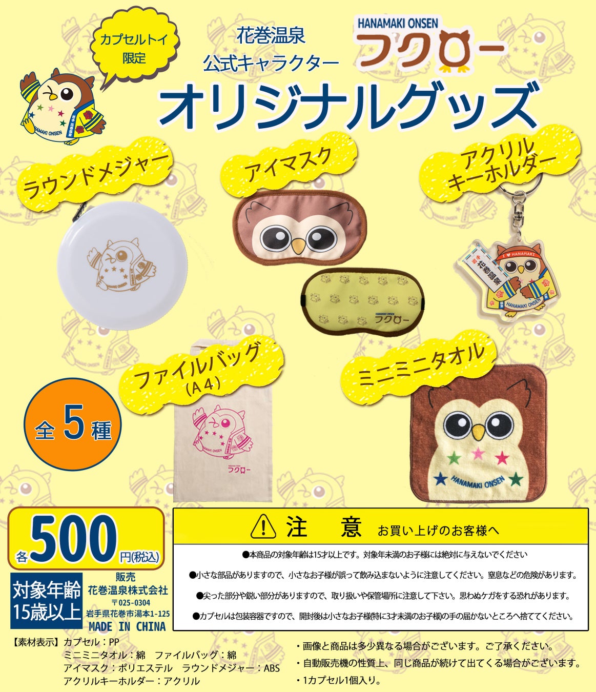 公式キャラクターフクローが描かれた「花巻温泉公式キャラクターフクローオリジナルグッズ」(1回 500円 税込・全5種)をカプセルトイ限定で販売いたします。ご宿泊の思い出に、またお土産に、どれが当たっても楽しい商品を揃えました。