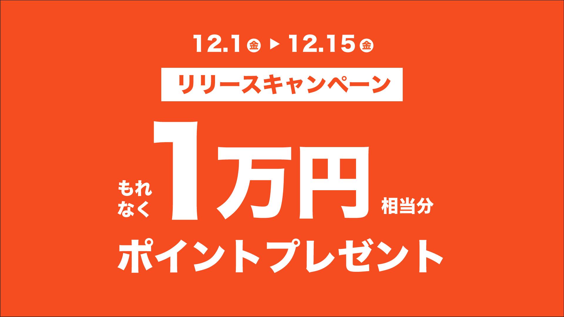 12月1日(金)~12月15日(金)まで、新規会員登録を行なったユーザーに、もれなく1万円分のポイントをプレゼントするキャンペーンを実施します。