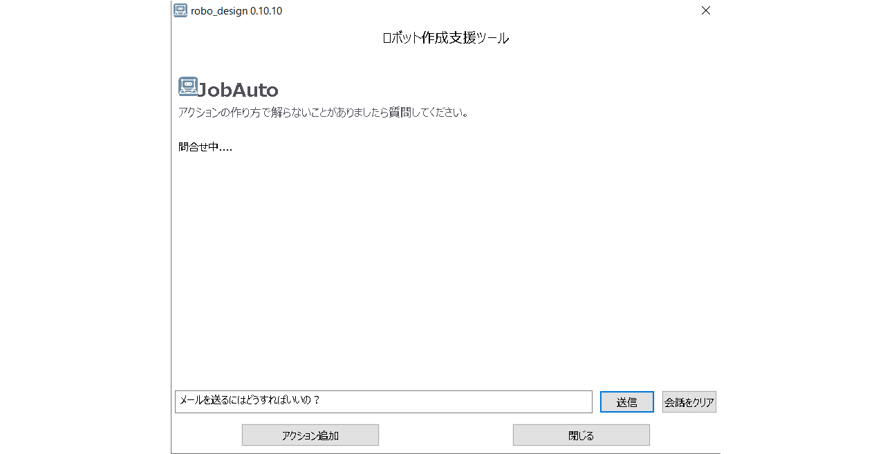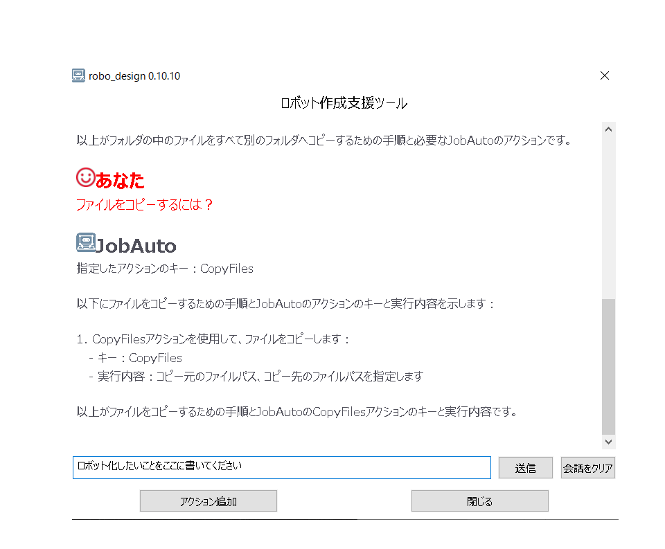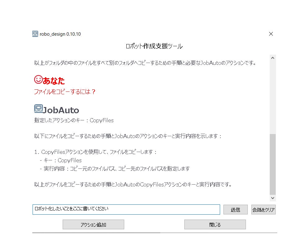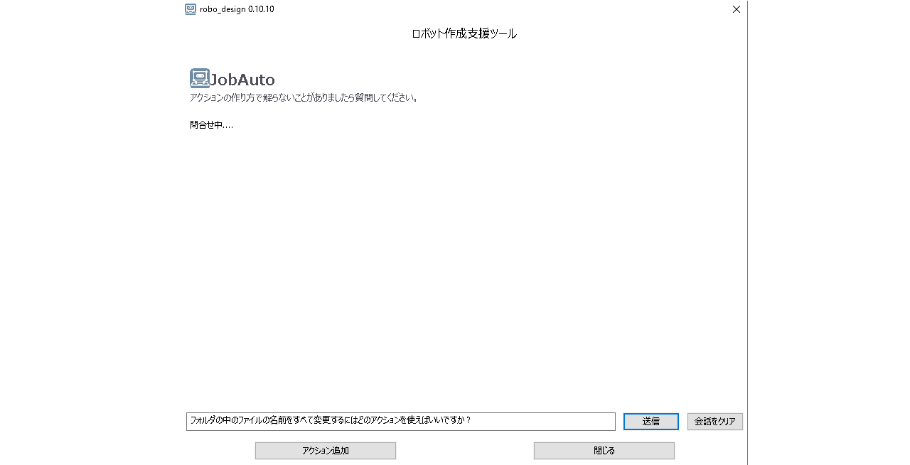 生成AIを使ったロボットの作成をサポートする機能です。生成AIへロボットの作成に関する質問をします。たとえば「フォルダの中のファイルの名前をすべて変更するにはどのアクションを使えばいいですか?」と質問します。AIから返ってきた回答を確認し、NGであれば再度質問をします。OKであれば、ロボットへ配置します。そして配置されたそれぞれのアクションの設定を行います。