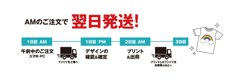 オリジナルデザインの商品は、お客様の必要なタイミングで想像通りの商品を手にできることが、最も重要です。お客様が望む日に必ずお届けできるよう、当社では効率化を徹底したオペレーションや最新のプリント設備により、翌日発送を実現しました。このサービスに特別な料金は必要ありません。