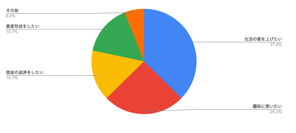 アンケート調査によると、生活の質を上げたい、という回答が最も多く、その次に趣味に使いたいという結果になりました。借金の返済をしたい方と資産形成をしたい方も同率に多いアンケート結果となりました。