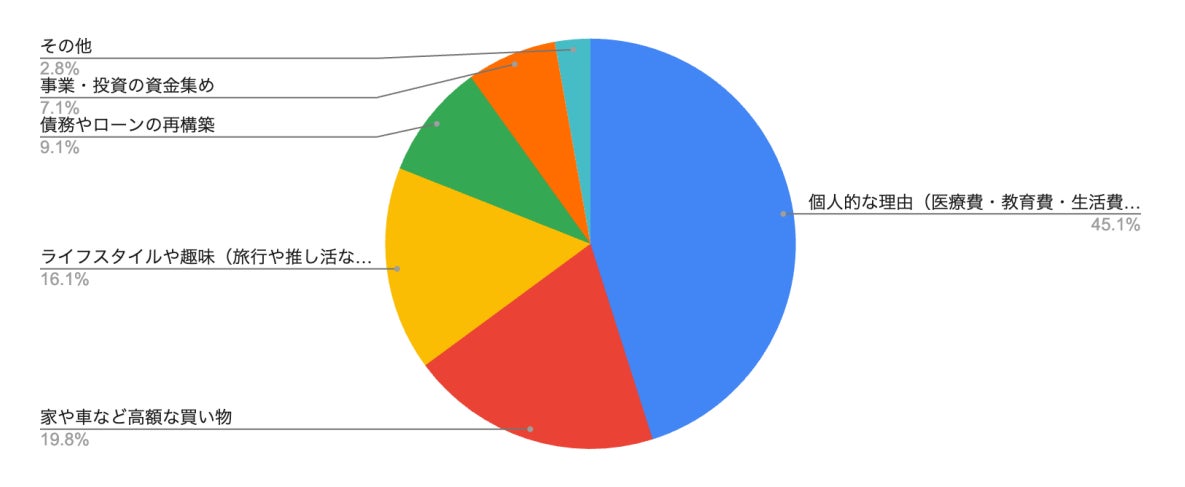 アンケート調査によると、個人的な理由の方が45.10%という結果になりました。その他には、高額な買い物や、趣味などでお金が必要・借りることを検討した方が多い結果となりました。