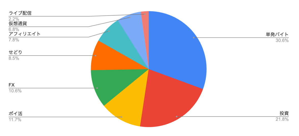 アンケート調査によると、単発バイトが30.60%、投資が21.80%という順番で多い結果となりました。確実にお金を稼ぐことのできる単発バイトの人気が高いようです。
