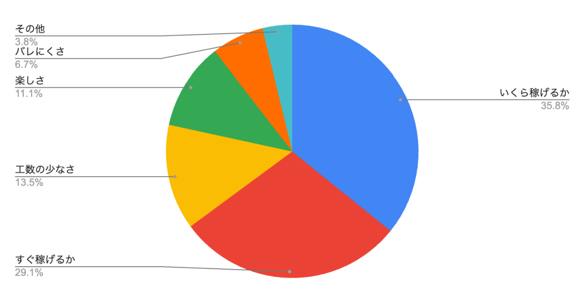 アンケート調査によると、すぐに稼げるより、いくら稼げるか、金額を重視する方が多いようです。いくら稼げるか、すぐ稼げるか、工数の少なさ、という順番で重視されているようです。