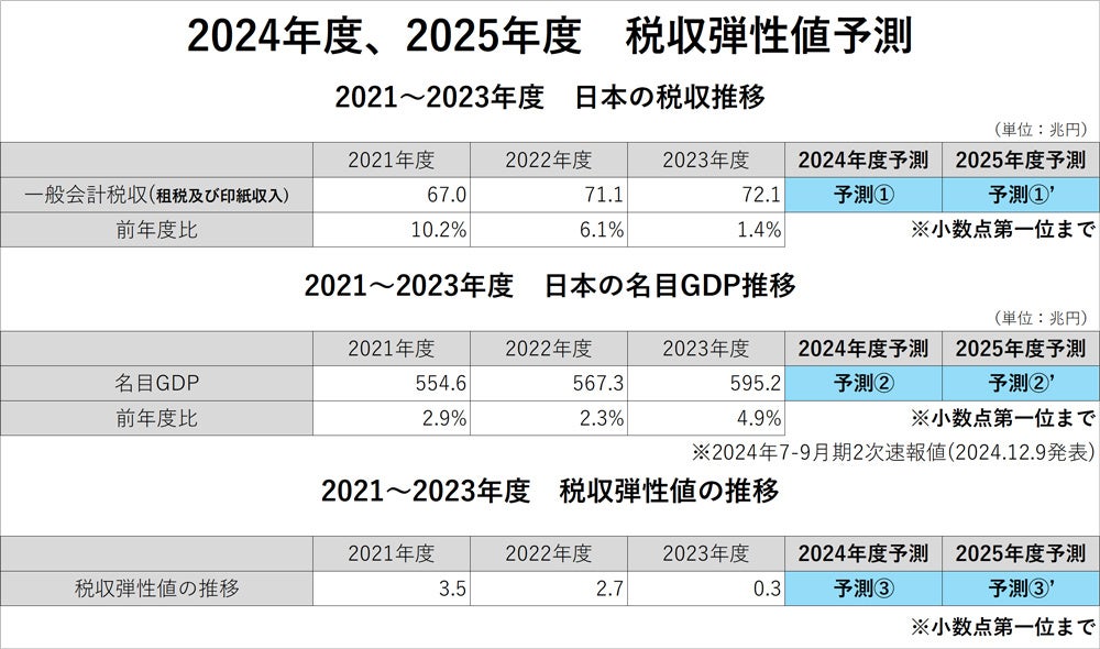 2024、2025年度の「一般会計税収」「名目GDP」「税収弾性値」の予測 |