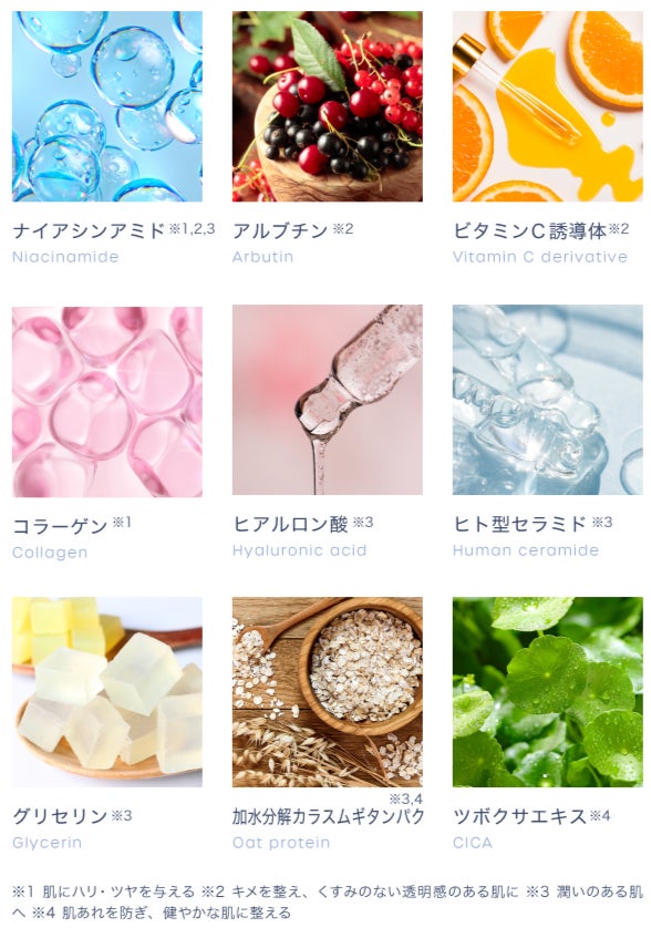ナイアシンアミドをはじめとした年齢肌へのケアを第一に考えた厳選9成分を配合しています。