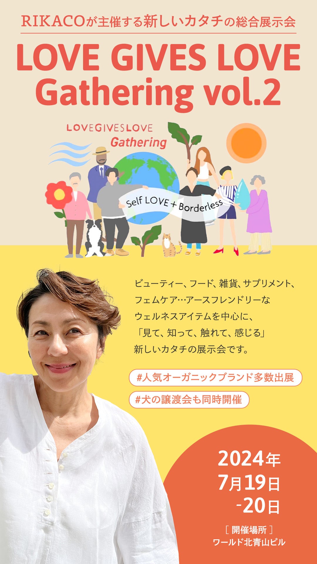 RIKACOが主催する 「LOVE GIVES LOVE Gathering」は、吉川千明をエグゼクティブサポーターに迎えた キュレーションイベントです。男性も女性も、あらゆるバックグラウンドや年齢層に関わらず、「見て、知って、触れ て、感じる」ことを通じて、「Self LOVE」の本当の意味を見つけ、「ボーダーレス」な価値観を育むことで、自 分が本当に求めるものを自由に選び、誰もが自分らしく輝けるライフスタイルを築くきっかけづくりの場となればと 願っています。