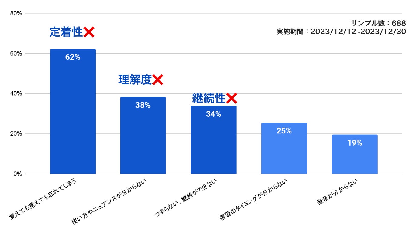 2023年12月12日〜12月30日に弊社が英語学習者688名から回収してきたアンケートによると、単語学習における最も一般的な課題は、"覚えても覚えても忘れてしまう"(62%)というものでした。これは、従来の学習方法では長期記憶に移行しづらく、定着しにくいという問題を示しています。2番目に多かった回答は、「実際の使い方が分からない、ニュアンスが理解できない」(38%)であり、これは単語のコンテキスト理解の難しさを反映しています。そして3番目は「つまらない、継続できない」(34%)という意見が挙がり、学習へのモチベーション維持が重要な課題であることが明らかになりました。
