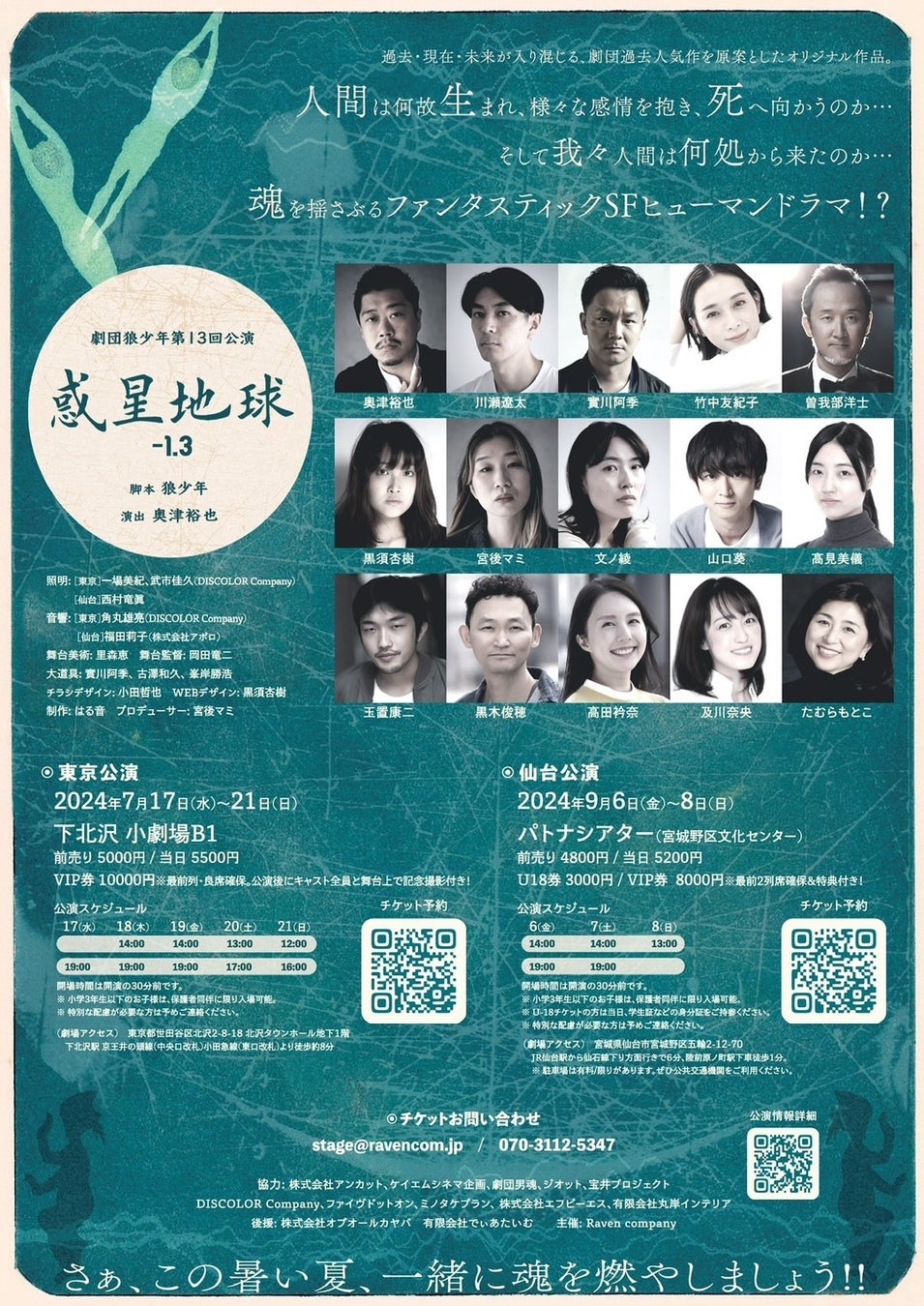 劇団狼少年第十三回公演『惑星地球-1.3』仙台公演が、2024年9月6日(金)〜 9月8日(日)宮城県仙台市パトナシアター(宮城野区文化センター)にて上演される。チケットは、こりっち予約サイト・チケットぴあにて発売中。