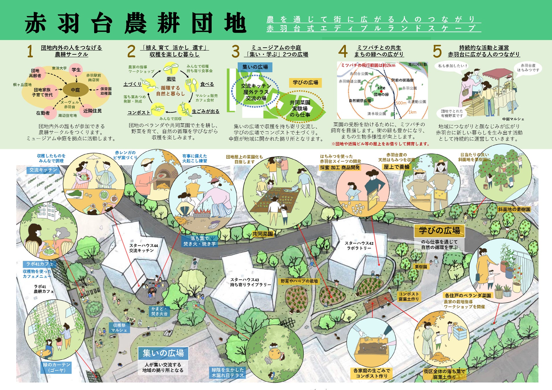 当コンペでは、ミュージアムの緑豊かな屋外空間を実験場として、新たな風景をつくり出す活動、デザイン、ビジネスのアイデアを令和5年12月~令和6年1月で募集しました。応募84点から最優秀賞「赤羽台農耕団地」以下、受賞企画9点(詳細は下記URL)を決定し、URはこれら受賞企画者と、今年度から各企画の実現化を目指します。実現化に向けた活動を通して、将来、共同で新たな事業創出につなげる「事業パートナー」となることも視野に入れています。