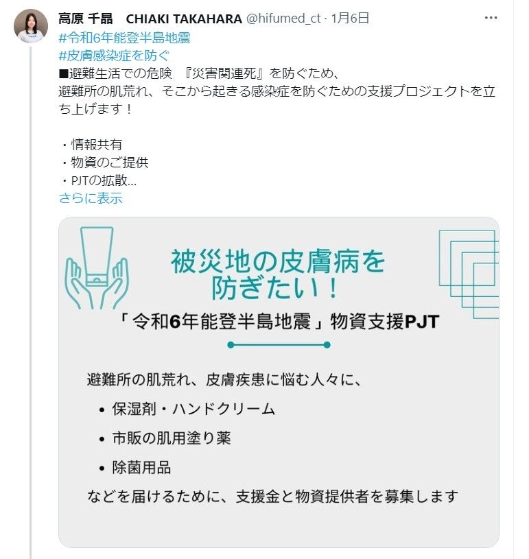 皮フ科のオンライン診療事業を運営するGenon社は、能登半島地震発生直後から、避難所での「皮膚科薬や保湿剤、除菌用品の不足から起きる皮膚の炎症・乾燥による肌荒れ」「それらの皮膚の問題から起きる感染症」を防ぐことを目的に、同じように皮膚の悩みを持つ日本中の皮膚科患者様から支援を募り、提携先の薬局から集めた保湿剤・除菌用品などの物資を避難所に届けるというPJTを発足しました。