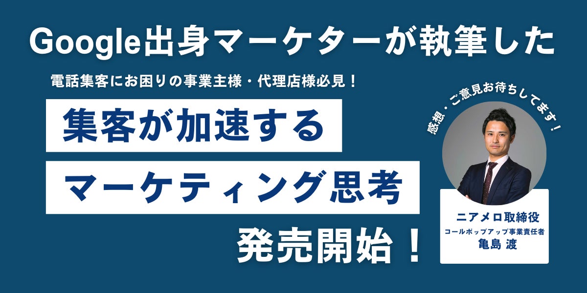 株式会社ニアメロ(本社:東京都渋谷区、代表取締役:坂田裕貴)は、弊社取締役亀島が「集客が加速するマーケティング思考」を執筆、発売開始したことをお知らせいたします。