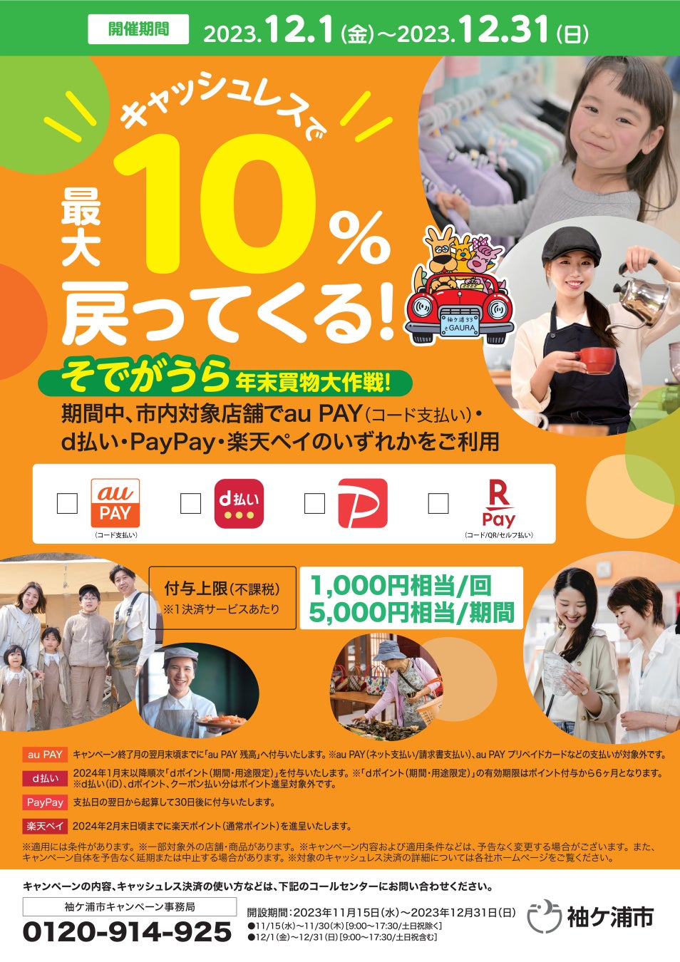 千葉県 袖ケ浦市では2023年12月1日(金)から12月31日(日)まで、対象キャッシュレス決済を利用すると、お支払い額の最大10%(1回あたり上限1,000円相当、期間中上限5,000円相当)のポイントを還元するキャンペーン「そでがうら年末買物大作戦」を実施します。