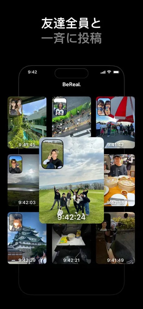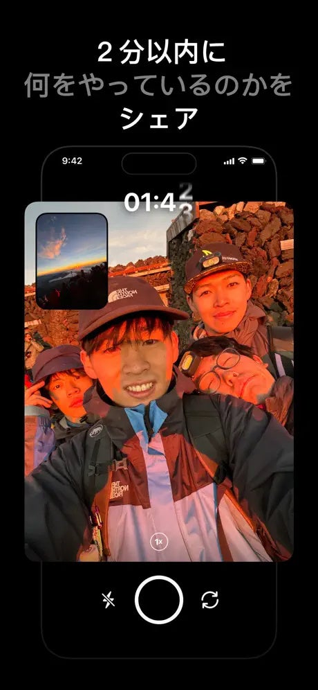 1日1回、あなたのリアルな日常を写真に収め、友達と共有する最もシンプルな写真共有アプリです。自撮り写真と正面写真(内カメ/外カメ)を同時に撮影できるように設計されていることも特徴の一つです。