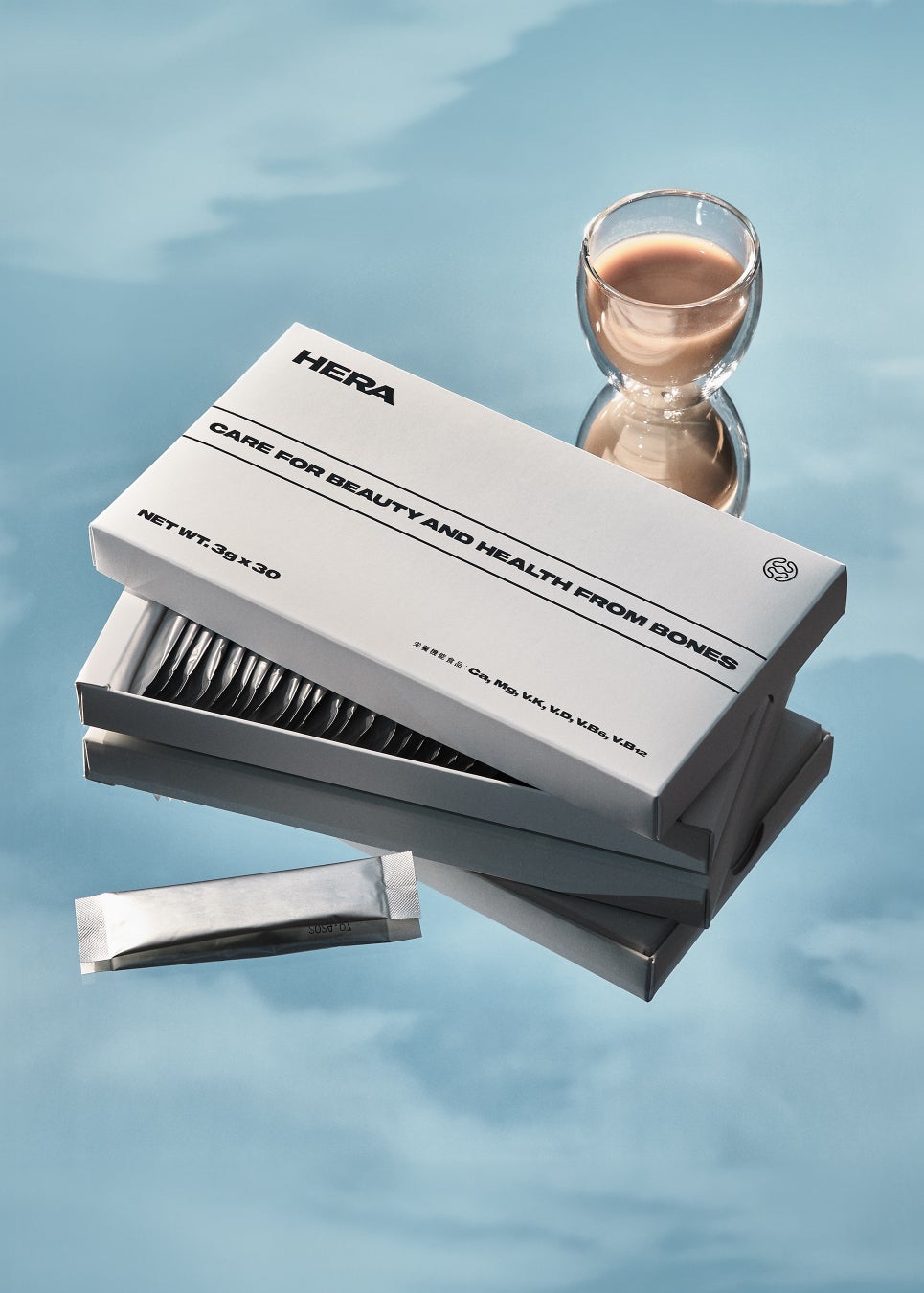 骨を作るためには、カルシウムやマグネシウムといったビタミンが⽋かせないと⼀般的に⾔われますが、骨の健康を維持するためにはそれだけでは不⼗分です。ビタミンDがカルシウムの吸収を促進して骨の形成を助け、ビタミンK、ビタミン B6、ビタミンB12といった栄養素も、骨の健康と大人の美をサポートするために大切です。これらをバランスよく摂取することが、健康な骨と美肌を保つ上で欠かせません。骨の悩みを抱える多くの⽅々に、⽇常的に簡単に⾏えるケアやサポートが必要との想いからHERAが⽣まれました。