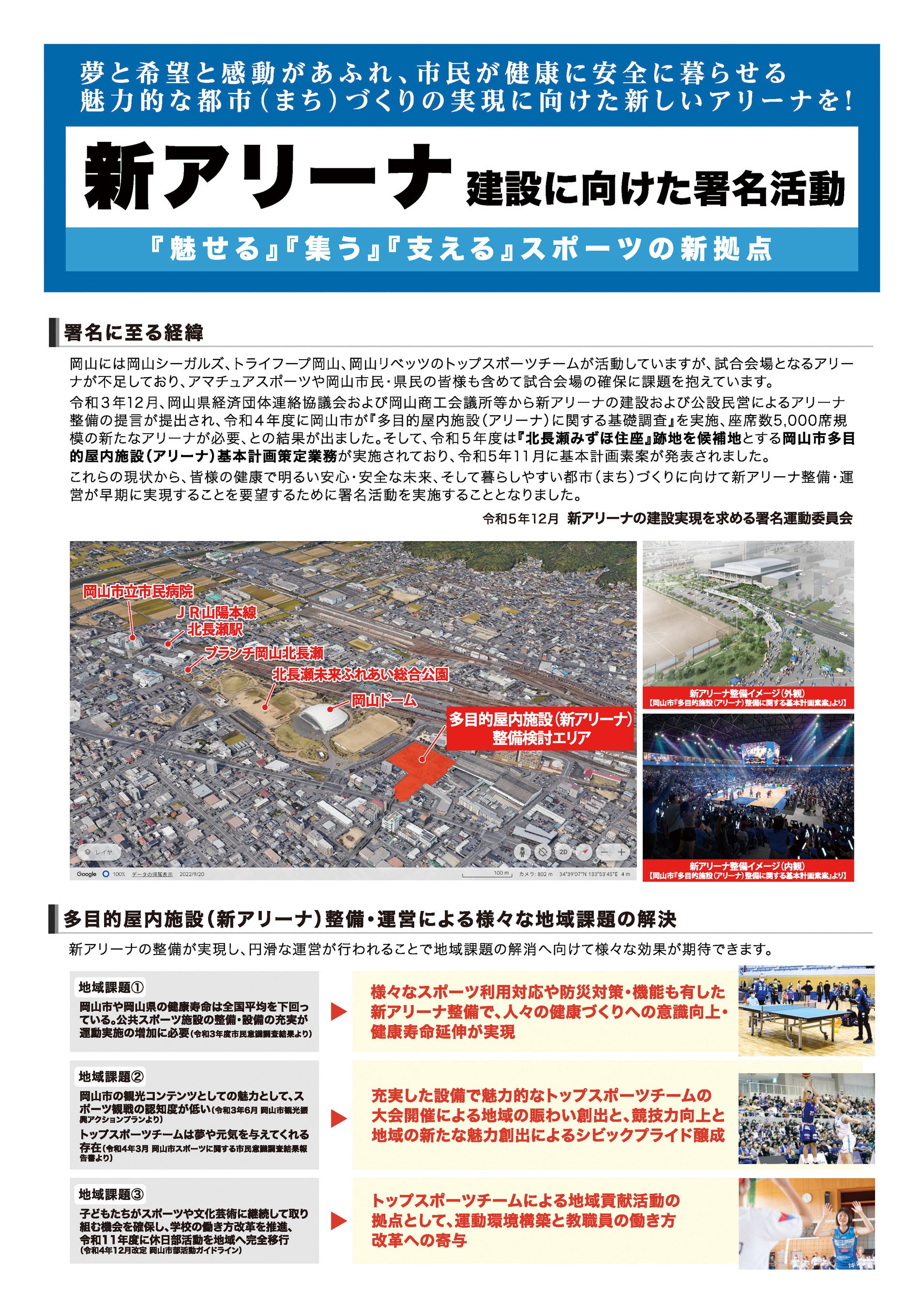 これらの現状から、皆様の健康で明るい安心・安全な未来、そして暮らしやすい都市(まち)づくりを実現する新アリーナ整備・運営が早期に実現することを要望するために署名活動を実施することとなりました。