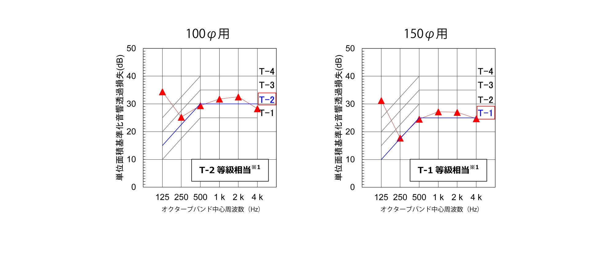 これにより従来の高性能防音型ベントキャップと同等の遮音性能を発揮し、スリーブ直径 100mm 用で「T-2 等級相当※1」およびスリーブ直径 150mm 用で「T-1 等級相当※1」の遮音性能を達成しています(図 2 参照)。