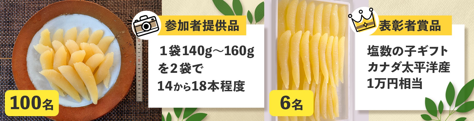 ・表彰者賞品:高級塩数の子ギフト1万円相当を贈呈します。