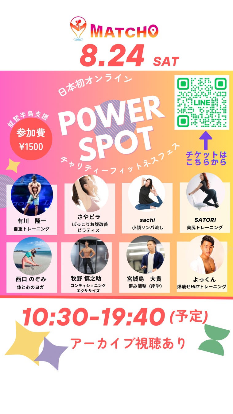 株式会社MATCHO(本社:広島県広島市中区、代表:石森 裕美代表取締役社長、以下、MATCHO)は、2024年8月24日土曜日に、総合的なコンテンツを含んだ日本で初めてとなる完全オンライン開催のチャリティーフィットネスフェス「Power Spot」を開催します*1。チケットは、本日より発売開始となり、今回のチケット売上は、全額*2能登半島地震の災害義援金に寄付します。