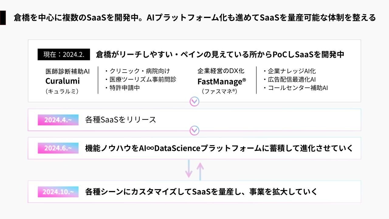 またFastManage®は、企業経営のDX化を推進するサービスとして展開予定で、まず企業内のナレッジをAIに蓄積し、社内共有や情報調査を効率化するSaaSを開発中です。今後は広告配信を最適化するAIやコールセンターの補助AI、人材採用支援AIなどもSaaS化していく計画です。